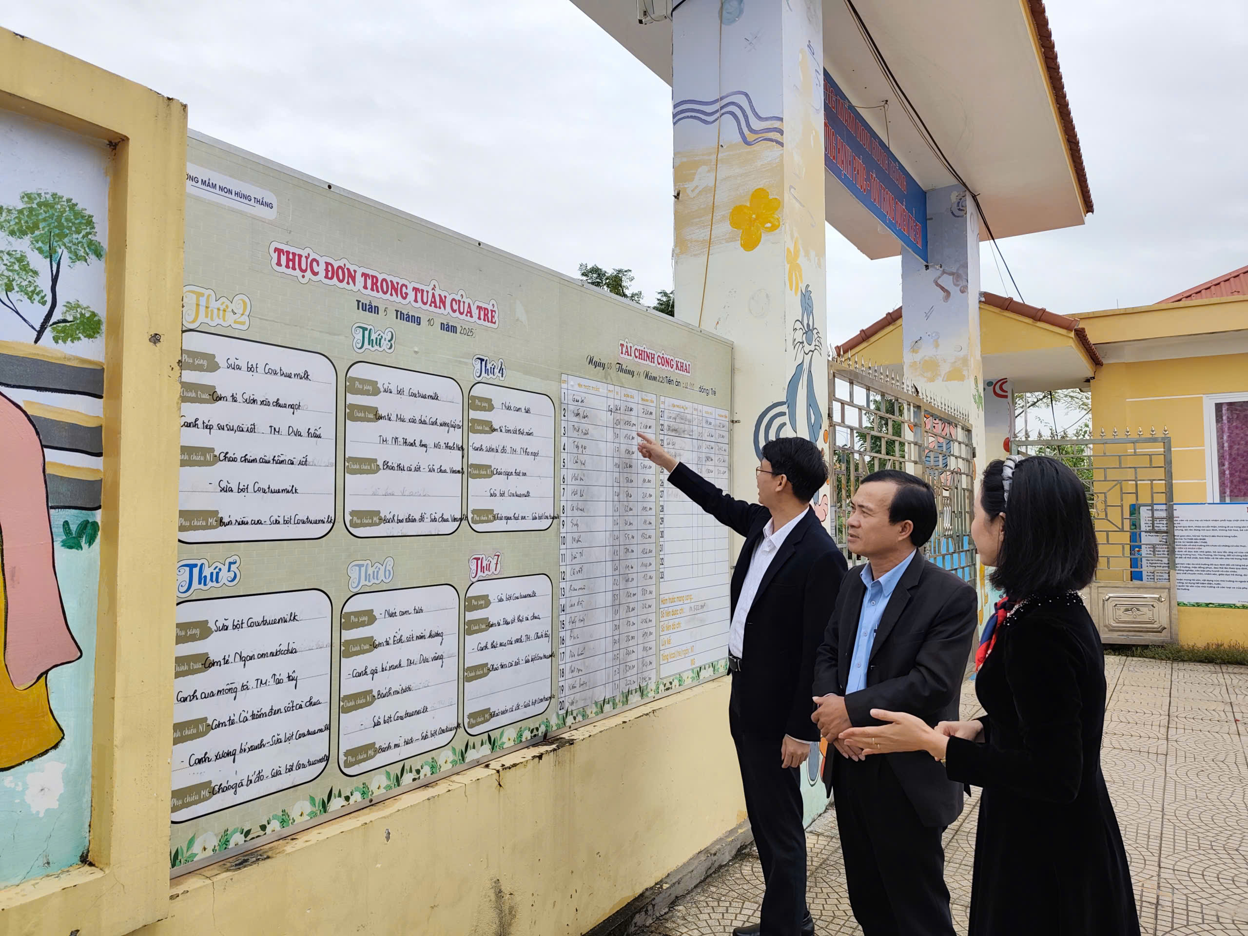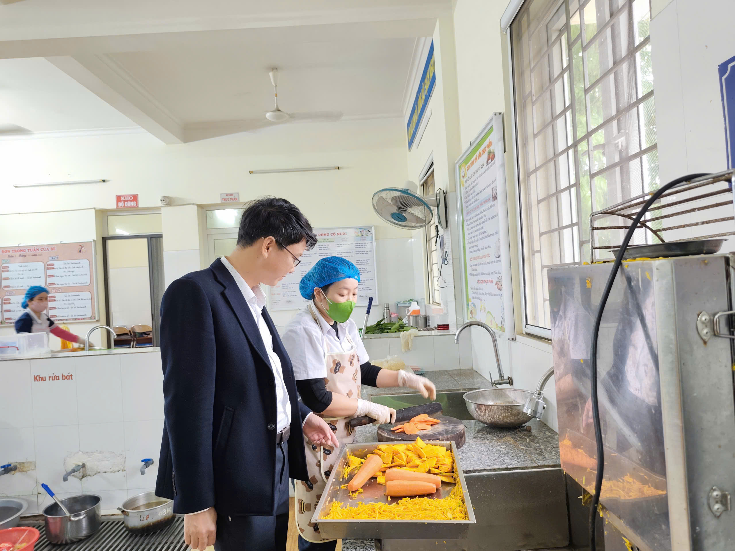 Trước khi làm việc với Ban Giám hiệu, đoàn đã kiểm tra thực tế cơ sở vật chất, thăm các phòng học, phòng chức năng và khu bếp ăn bán trú. Qua kiểm tra, đoàn ghi nhận công tác chăm sóc, nuôi dưỡng, bảo đảm an toàn vệ sinh thực phẩm được nhà trường thực hiện nghiêm túc, đúng quy định.