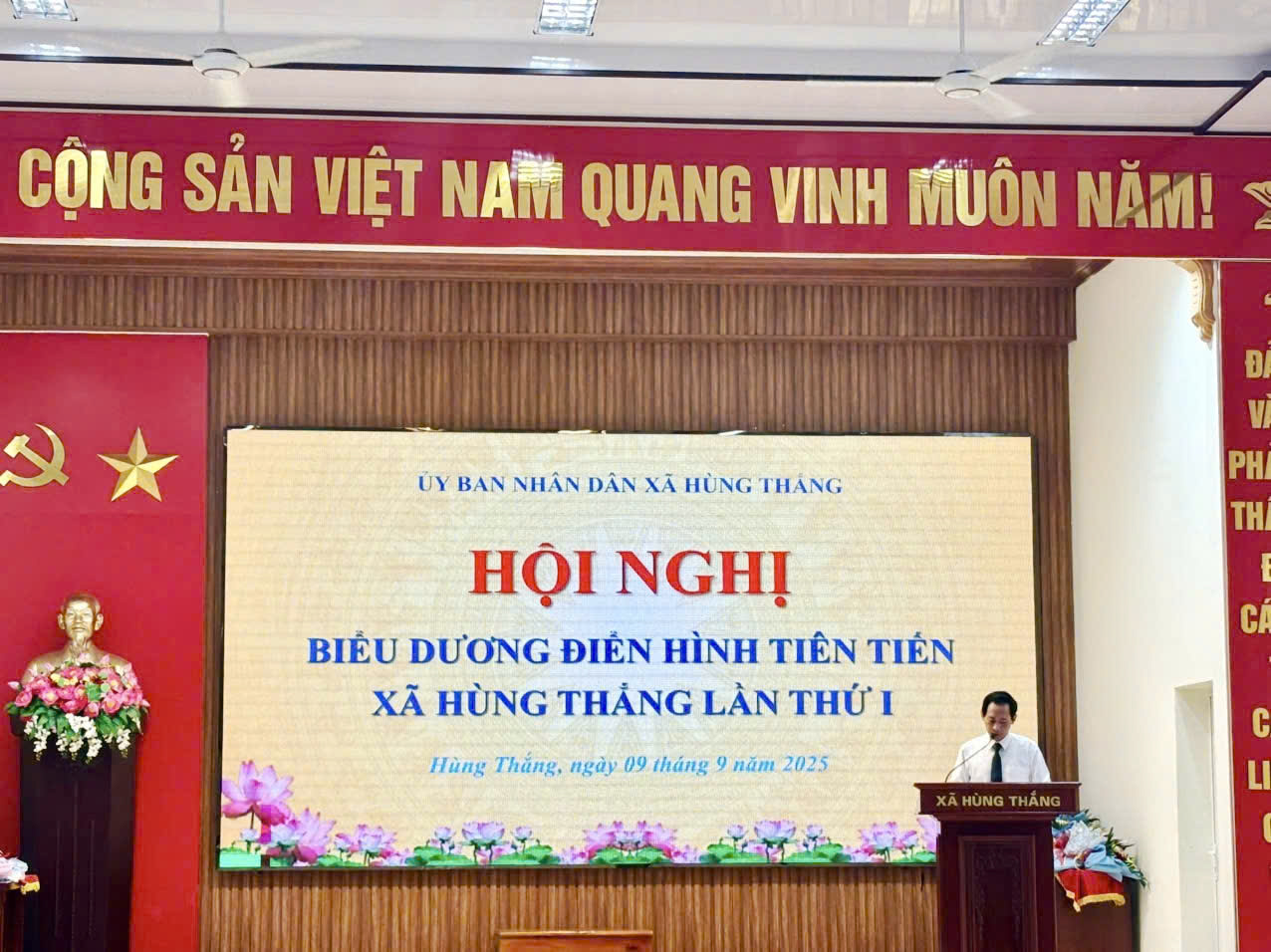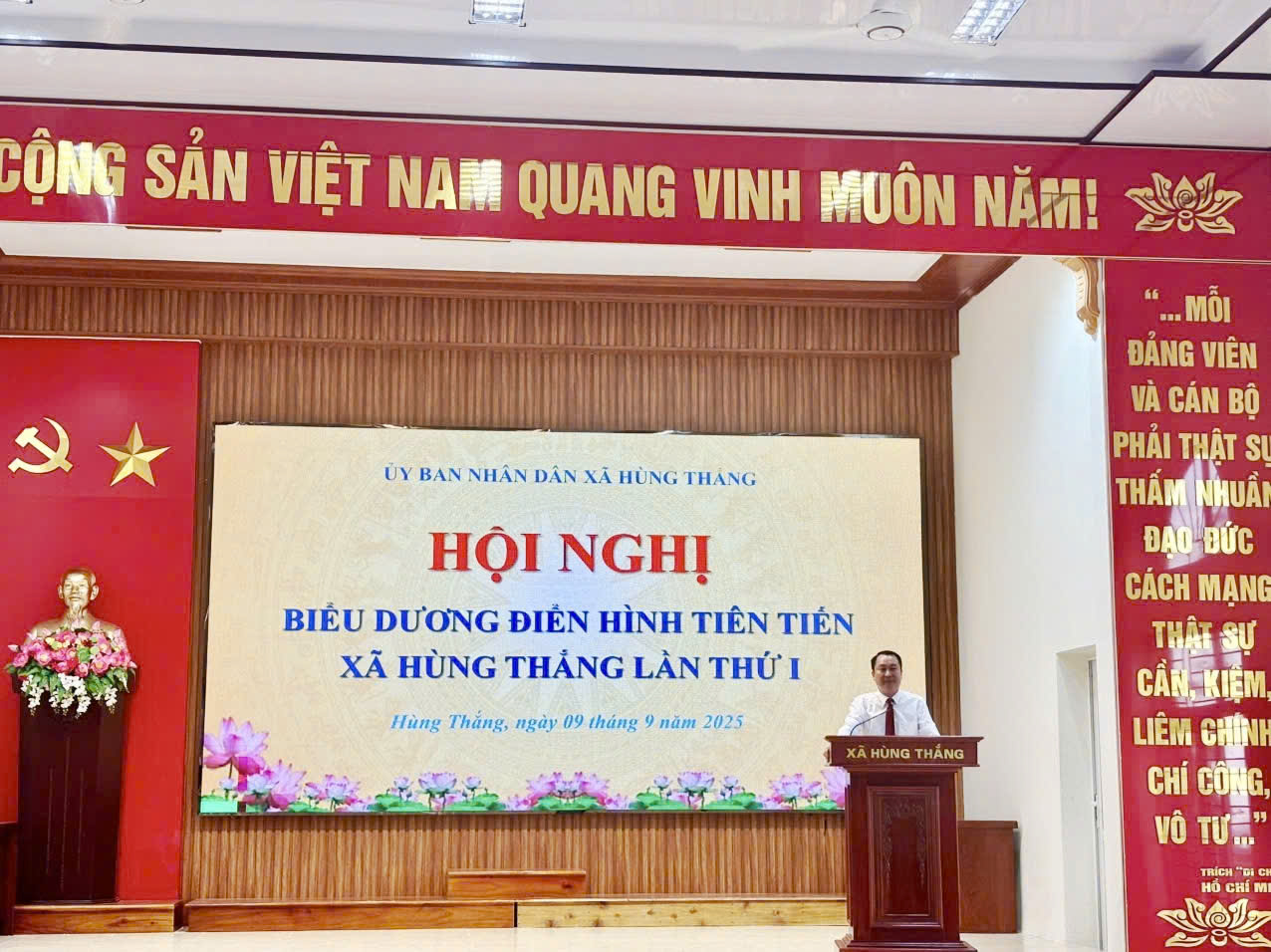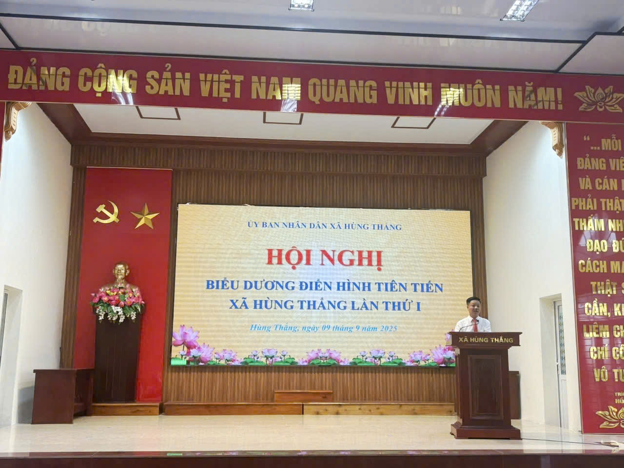 Chiều ngày 9/9/2025, tại Hội trường Nhà văn hóa xã, UBND xã Hùng Thắng long trọng tổ chức Hội nghị tuyên dương điển hình tiên tiến lần thứ I. Tham dự hội nghị có các đồng chí: Đỗ Mạnh Hiếu – Bí thư Đảng ủy, Chủ tịch HĐND xã; Nguyễn Anh Tú – Phó Bí thư Thường trực Đảng ủy xã; Nguyễn Ngọc Huy – Phó Bí thư Đảng ủy, Chủ tịch UBND xã, Chủ tịch Hội đồng Thi đua – Khen thưởng xã; Các đồng chí trong Ban Thường vụ Đảng ủy, lãnh đạo các phòng, ban chuyên môn, các đoàn thể chính trị - xã hội, cán bộ, công chức, người lao động, đại diện các thôn và các tập thể, cá nhân điển hình tiên tiến tiêu biểu trên địa bàn.