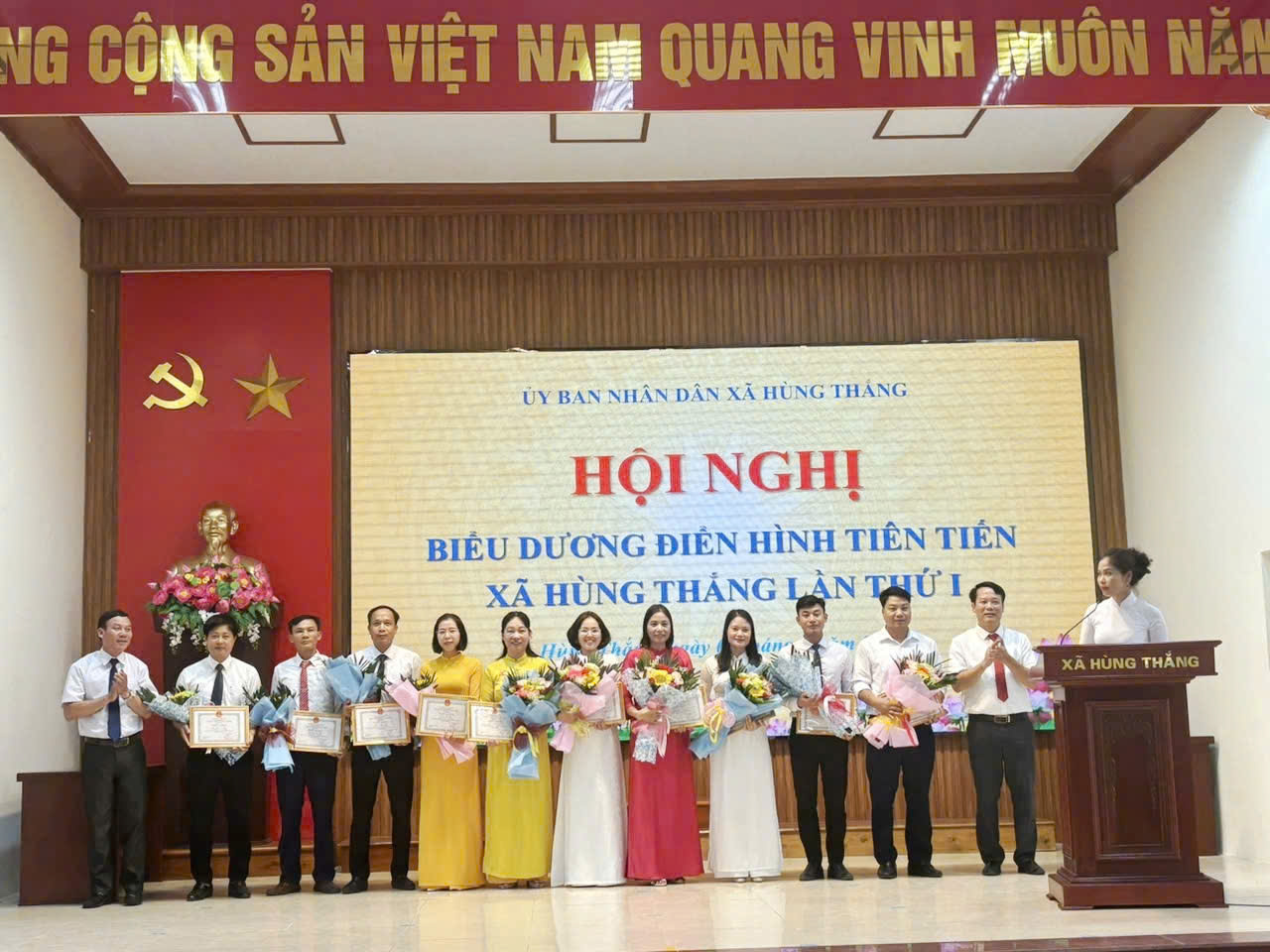 Hội nghị đã tuyên dương, khen thưởng 1 tập thể, 10 cá nhân và 6 hộ gia đình điển hình tiên tiến, góp phần lan tỏa sâu rộng tinh thần thi đua yêu nước, khích lệ cán bộ, đảng viên và nhân dân trong toàn xã tiếp tục phấn đấu, chung sức, đồng lòng xây dựng xã Hùng Thắng ngày càng giàu đẹp, văn minh, hiện đại.