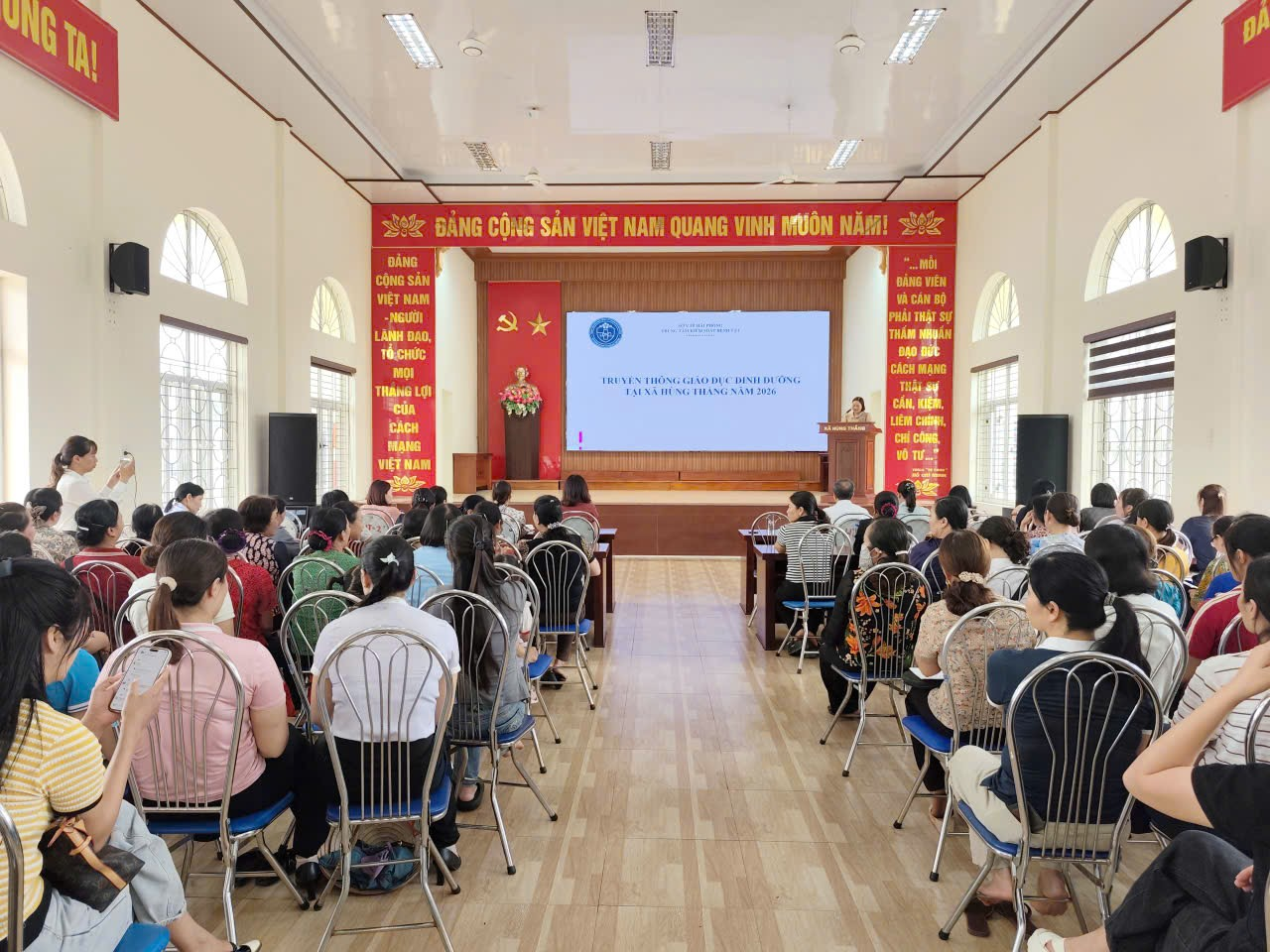 Chiều ngày 22/4, xã Hùng Thắng tổ chức hội nghị tập huấn, truyền thông về dinh dưỡng cho cán bộ, nhân viên Trạm Y tế xã; hội viên Chi hội phụ nữ các thôn; giáo viên phụ trách dinh dưỡng; nhân viên bếp ăn tại các trường Mầm non, Tiểu học trên địa bàn cùng phụ nữ trong độ tuổi sinh đẻ.